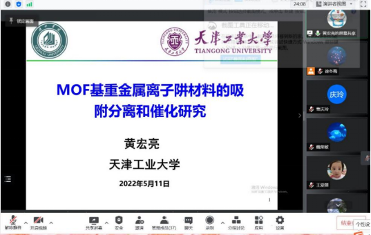 511日,51周年校庆日线上学术交流活动邀请天津工业大学研究员、博士生导师黄宏亮老师,做了题为MOF基重金属离子阱材料的吸附分离和催化研究的专题学术报告。我校相关研究方向教师、研究生以及本科生,通过腾讯会议方式参加了本次报告会。