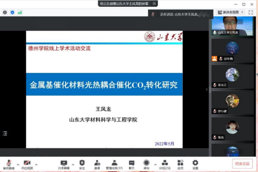 5月18日晚上,51周年“校庆日”线上学术交流活动邀请了山东大学教授、博士生导师王凤龙老师,做了题为“金属基催化材料光热耦合催化CO2转化研究”的专题学术报告。我校相关研究方向教师、研究生以及本科生,通过腾讯会议方式参加了本次报告会。