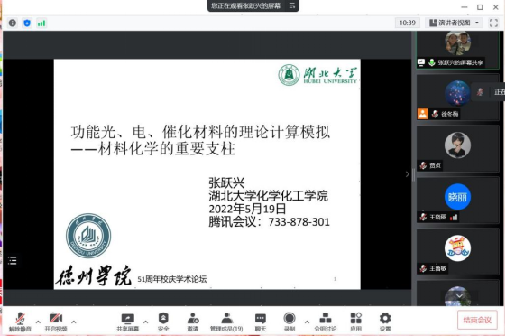 5月19日下午,51周年“校庆日”线上学术交流活动邀请了湖北大学教授、博士生导师张跃兴老师,做了题为“功能光、电、催化材料的理论计算模拟——材料化学的重要支柱”的专题学术报告。我校相关研究方向教师、研究生以及本科生,通过腾讯会议方式参加了本次报告会。