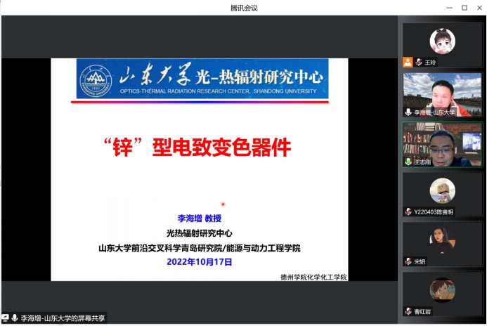 10月17日,伟德国际1946源于英国举办了主题为“黄河环境保护与高质量发展”的学术交流活动,邀请了山东大学前沿交叉科学青岛研究院、能源与动力工程学院双聘教授、博导李海增先生,作了题为《“锌”型电致变色器件》的专题学术报告,报告采用线上的方式,学院相关负责人、青年教师和研究生参加会议。