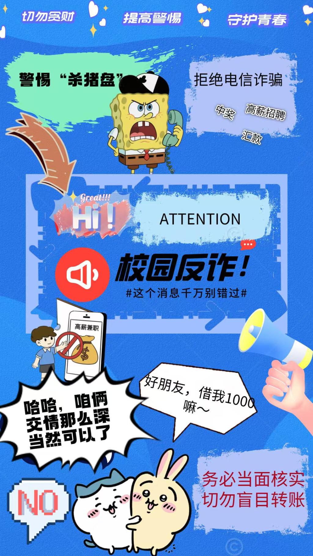 为切实守护学生财产安全,普及反诈知识,揭露常见诈骗套路,帮助学生掌握识别、防范诈骗的实用技巧,增强自我保护意识,11月12日-20日,学院开展“反诈护航,安全同行”反诈宣传海报设计活动。