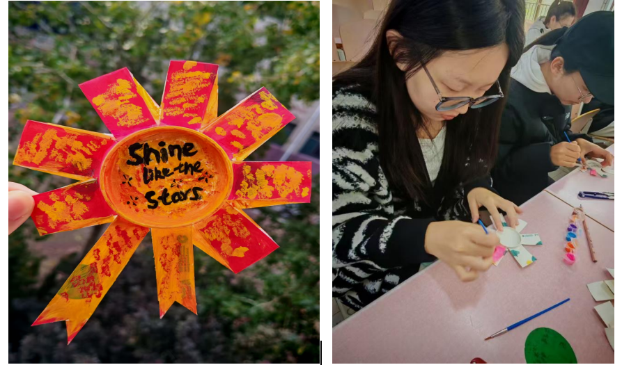 活动伊始,社团负责人首先为在场学生详细讲解了徽章的制作过程,并进行了关键步骤的演示。随后,大家有序领取制作工具与材料,认真按照步骤和操作要点进行剪裁、绘制。现场活动气氛热烈,创意飞扬。不久,一枚枚精致的徽章完成制作。每一枚徽章上都书写着大家精心挑选的英文标语,展现了他们独特的思考视角与语言运用能力。