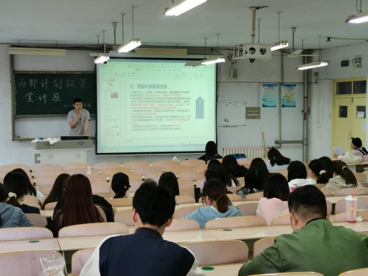 宣讲会上,辅导员老师首先分析了当前的就业形势,结合目前社会形势和自身经验,强调了转变就业思维、拓宽就业渠道的重要意义。鼓励大学生要敢于有梦、敢于追梦、敢于圆梦,让青春在为祖国的奉献中闪光。辅导员老师对西部计划项目介绍,报名流程进行了讲解,从政策支持、生活保障、服务内容、选拔标准等方面进行了详细解读。