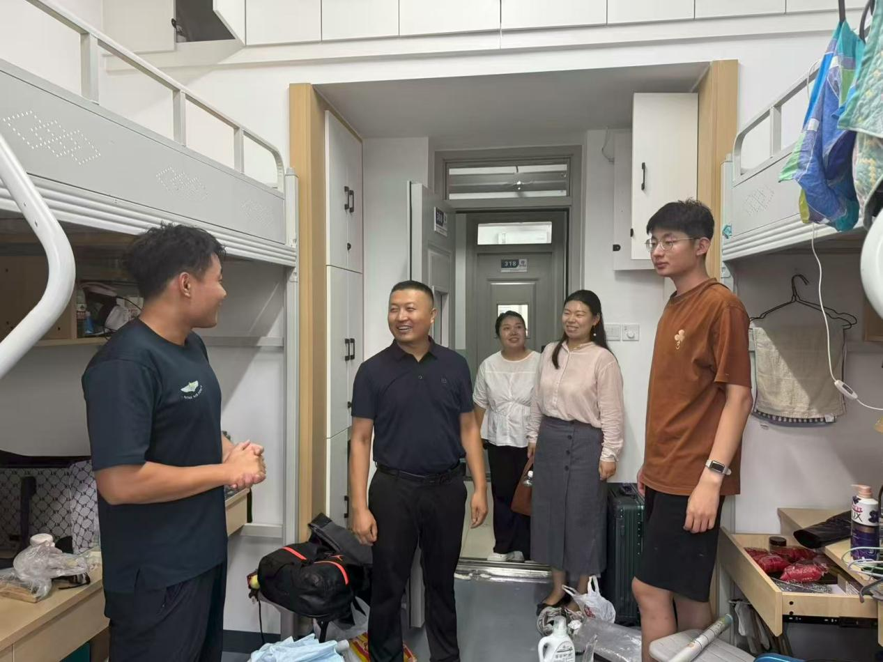 走访过程中,领导老师们轻叩房门,走进各间寝室,细致检查宿舍内的床铺稳固性、桌椅完好度、水电设施运行情况等,仔细询问同学们使用是否便利。交流中,学院党委副书记主动关切地询问学生的暑假生活趣事以及新学期的学习规划与生活期待。同学们敞开心扉,积极分享假期里的收获与感悟,畅谈新学期的目标与憧憬,现场气氛暖意融融,充满欢声笑语。领导们还勉励同学们,在新的学期里要保持昂扬向上的精神状态,既要潜心钻研学业,也要积极参与实践,勇于迎接挑战,在成长路上不断突破自我。