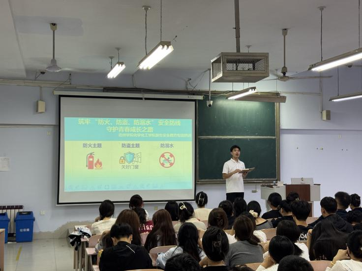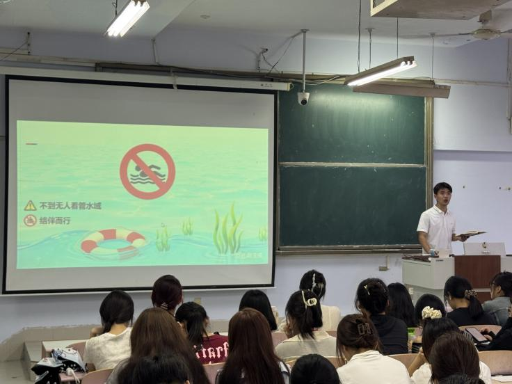 讲座中辅导员结合近年来校园及周边发生的安全案例,强调了人身财产安全对新生成长成才的重要性。在防火知识讲解环节,辅导员以 “警惕小火苗,守护大安全”为主题,通过播放火灾事故警示教育视频、展示校园常见火灾隐患图片,直观呈现了违规用电、易燃物品堆放等行为的危害。针对防盗安全,辅导员结合校园盗窃案例,从“宿舍防盗、随身财物防盗、网络诈骗防范”三方面给出具体建议。在防溺水安全专题环节,辅导员结合夏季溺水事故高发特点,重点强调了 “三不准” 原则:不准私自下水游泳、不准到不熟悉无安全设施的水域游泳、不准不熟悉水性者擅自下水施救。培训尾声,现场设置了互动问答环节,新生们积极提问,辅导员逐一耐心解答,进一步强化了新生对安全知识的理解与记忆。