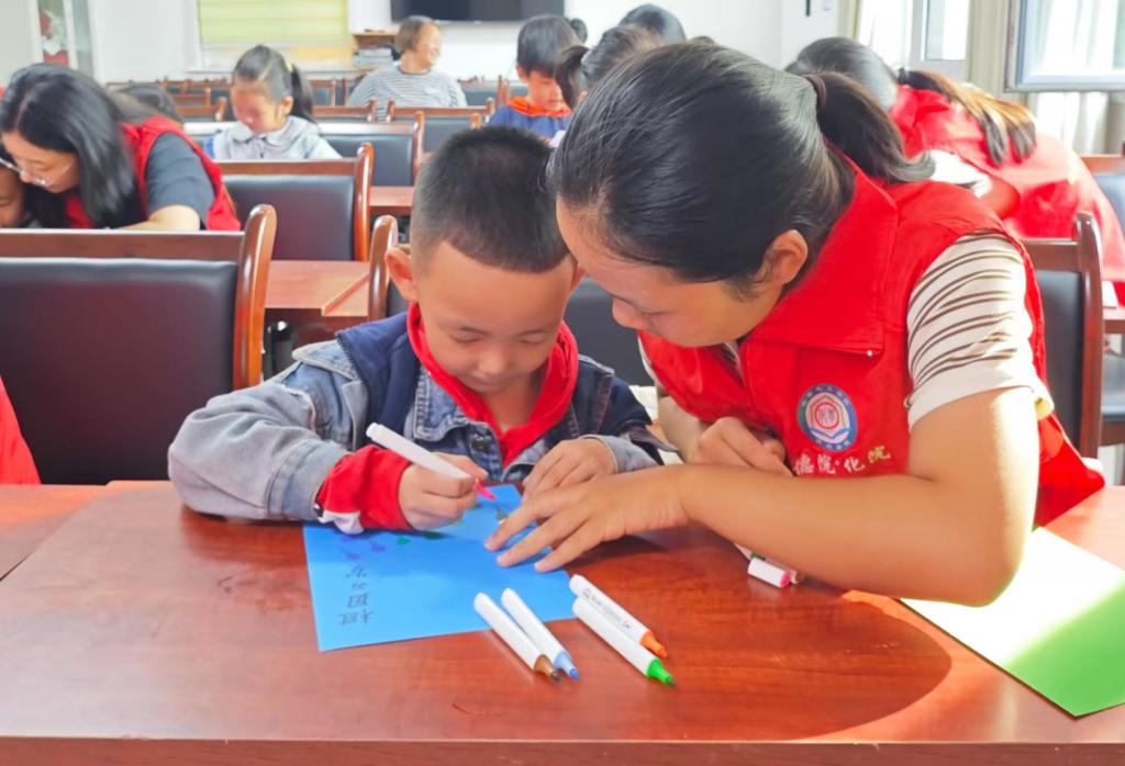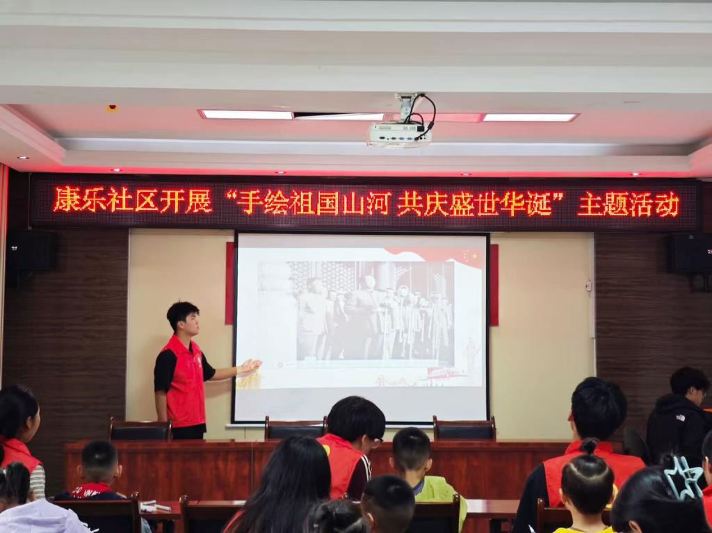 活动伊始,志愿者先借助PPT为小朋友们展示国庆节由来、国旗国徽设计寓意及祖国发展成就,帮助小朋友理解活动主题,激发对祖国的热爱与创作灵感。随后,志愿者为小朋友分发绘画工具,在志愿者们的协助指导下,鼓励小朋友自由创作,以画笔表达对祖国的祝福。创作完成后,志愿者们邀请小朋友上台展示画作,简单分享作品的含义与对祖国的祝福,现场童趣盎然,洋溢着浓浓的爱国氛围。