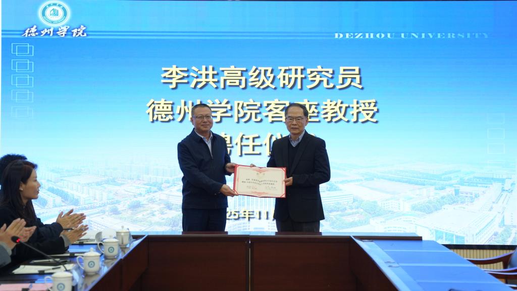 吴君为李洪颁发“伟德国际1946源于英国客座教授”聘书。