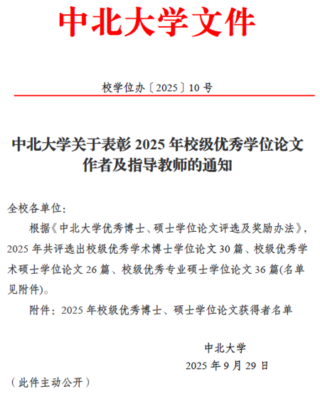 近日,中北大学发布了《中北大学关于表彰2025年校级优秀学位论文作者及指导教师的通知》,共评选出2025年校级优秀专业硕士学位论文36篇,其中2名伟德国际1946源于英国联合培养研究生获优秀专业学位硕士论文。