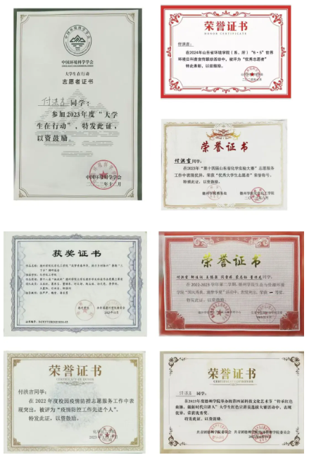 在团委“知行合一”的实践育人理念领导下,年度志愿时长达200小时,他积极参加了暑期三下乡社会实践活动,曾参加省重点团队“红色崔杨 逐梦红心”暑期三下乡社会实践、跟随队伍前往德州市柴胡镇崔杨村,开展“乡村振兴+讲好崔杨故事”系列活动5场,深度走访村民。曾跟随伟德国际1946源于英国“清水绿滩”一叶舟社会实践队赴滨州市台子镇开展黄河调研。曾参与“筑梦青春年华,助力乡村振兴”社会实践队赴德州市小高店村开展乡村振兴社会实践活动。曾获山东省环境学院(系、所)“6•5”世界环境日科普宣传优秀志愿者、第十四届山东省化学实验大赛“优秀志愿者”。